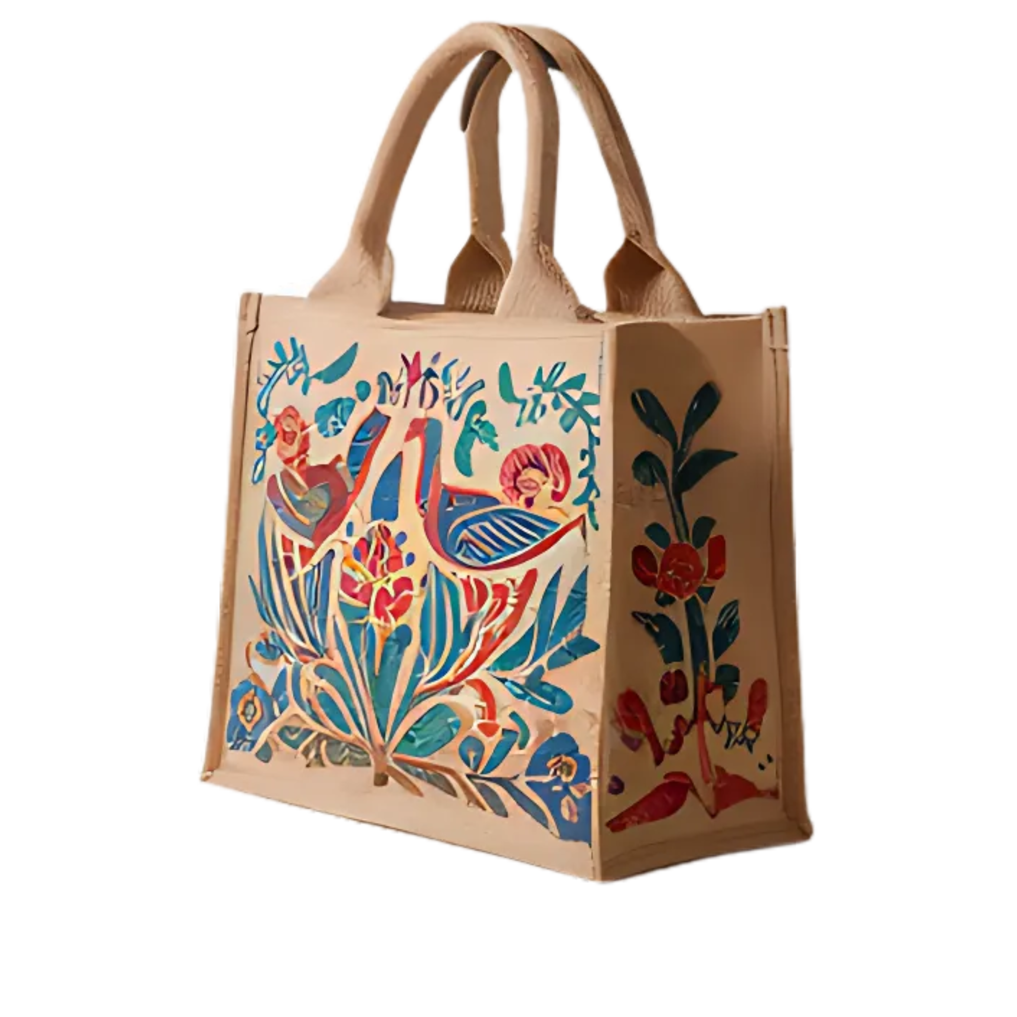 Crafted from 100% natural jute, this eco-friendly bag showcases intricate hand-painted birds and floral motifs in vibrant shades of blue, green, red, and gold, reflecting traditional Indian artistry. Its sturdy woven handles ensure durability and comfort, making it perfect for everyday use. Spacious, stylish, and biodegradable, this bag is a sustainable fashion statement that blends elegance with eco-conscious living. Carry culture, carry sustainability