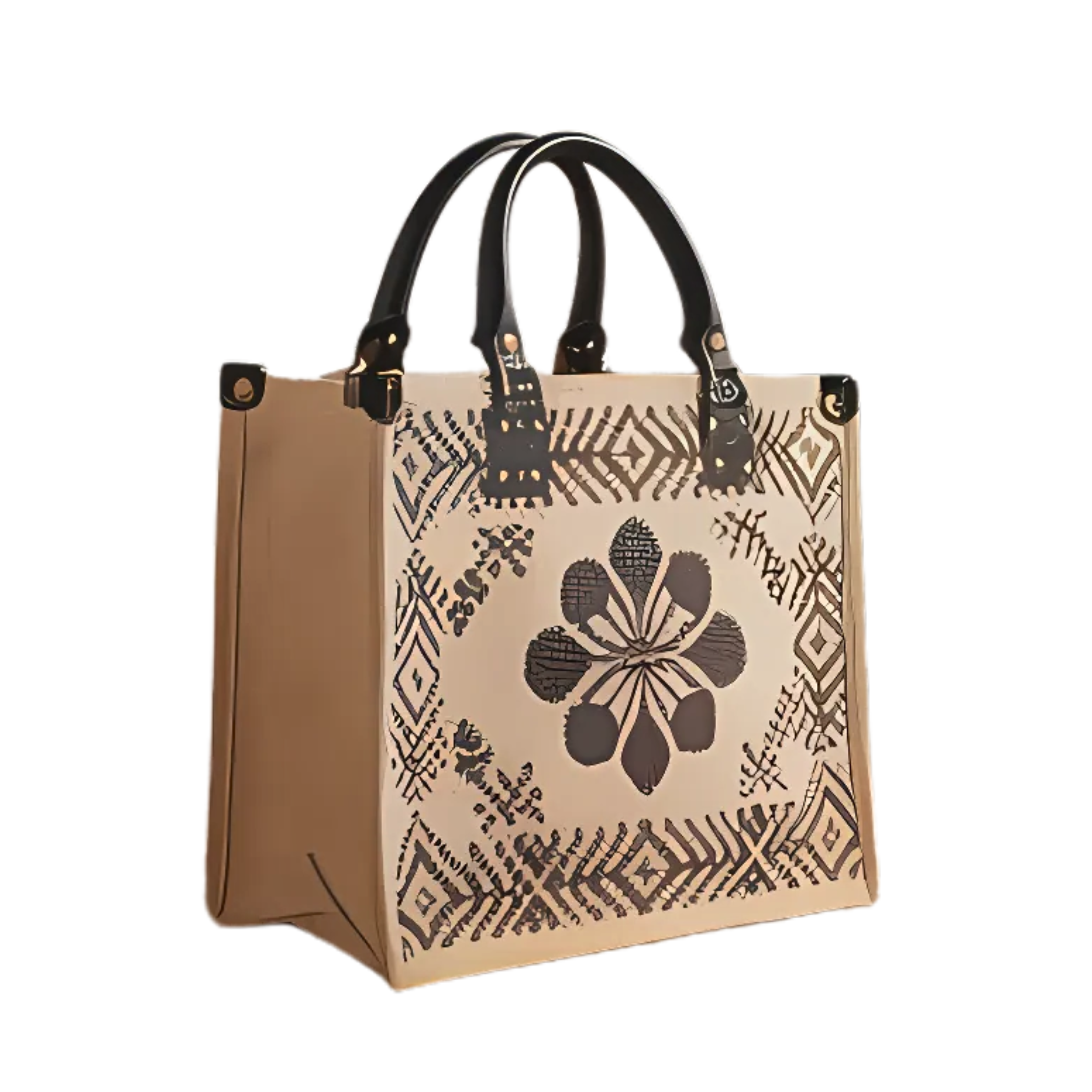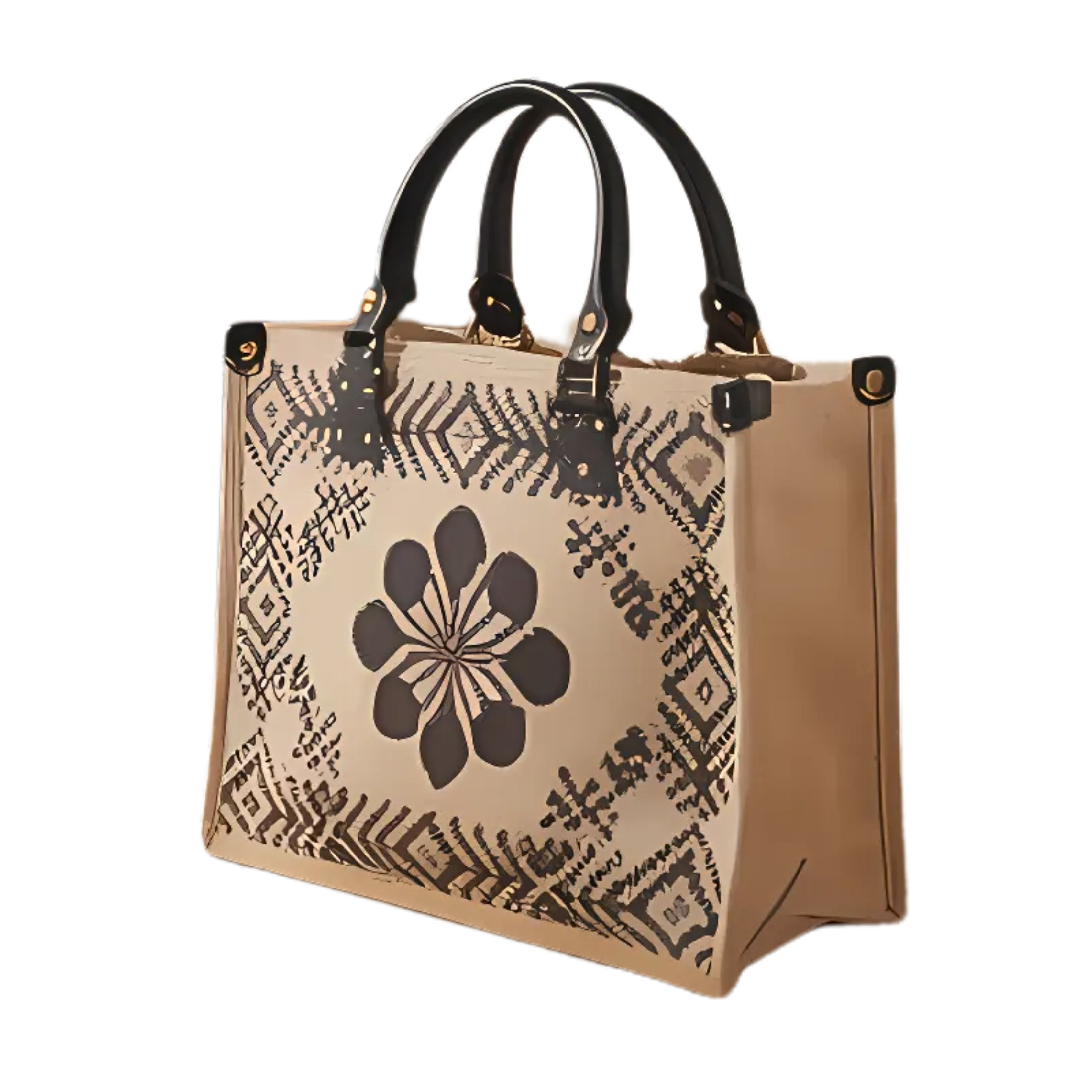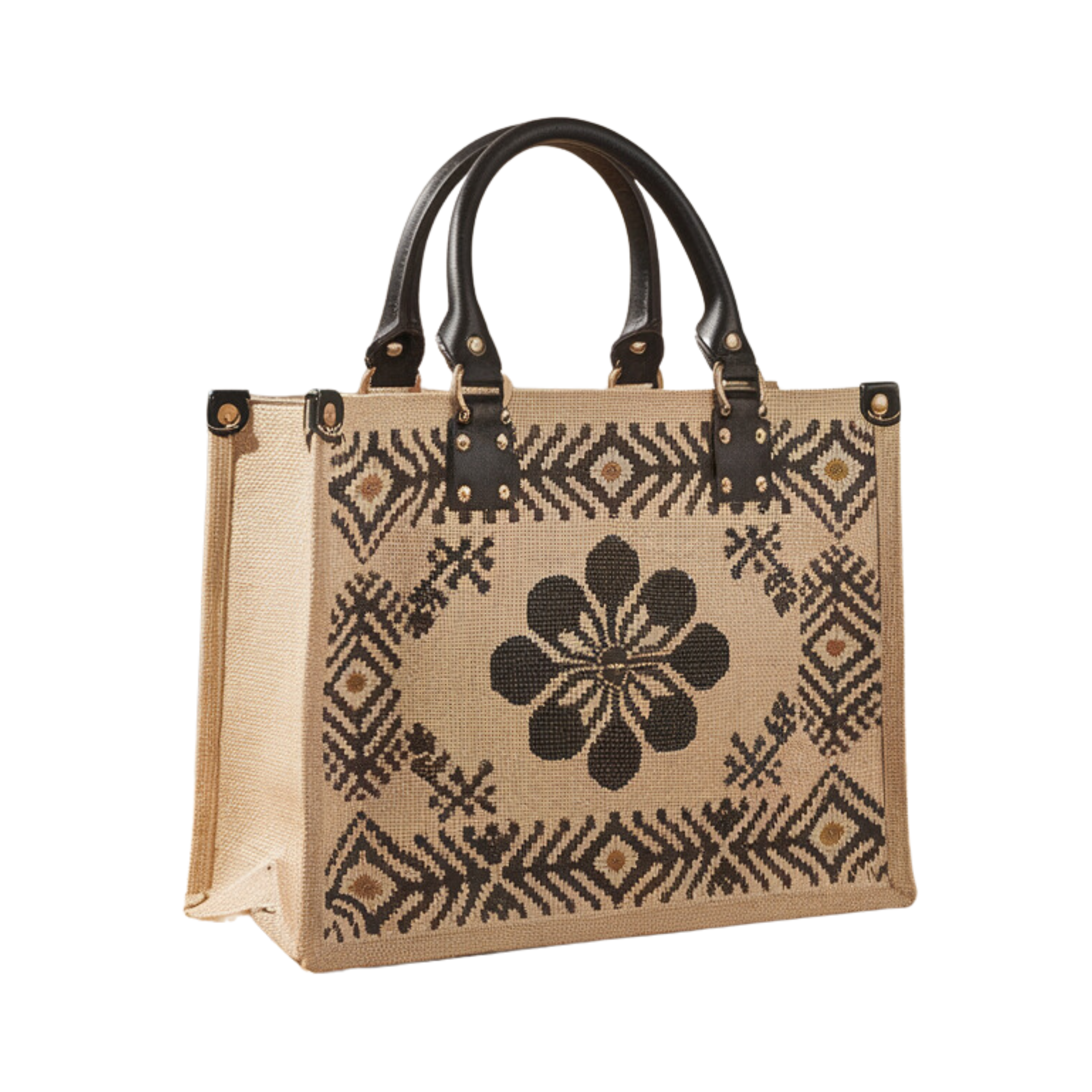 Blending tradition with contemporary elegance, the Heritage Weave Jute Tote is a statement of style and sustainability. Crafted from premium, eco-friendly jute, this bag features a meticulously handwoven black-and-white geometric floral design, inspired by age-old embroidery techniques. The sturdy black leather handles and reinforced corners with metallic accents ensure durability while adding a refined touch.