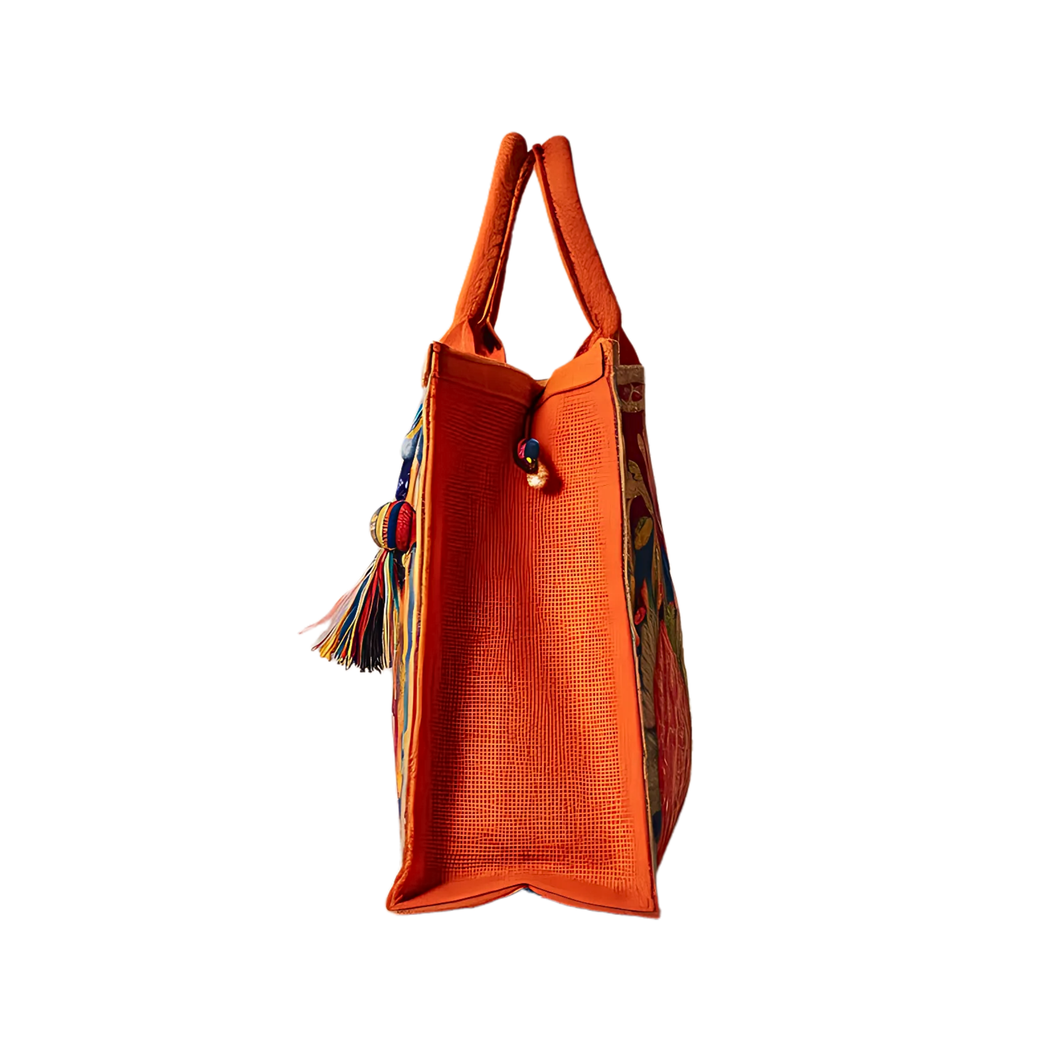 Designed for both beauty and function, the Jute features a striking orange jute side panel, adding contrast and depth. A playful multicolor tassel dangles from the sturdy woven handles, enhancing its artistic appeal. The structured yet lightweight design ensures versatility, making it the perfect companion for shopping, casual outings, or cultural events.