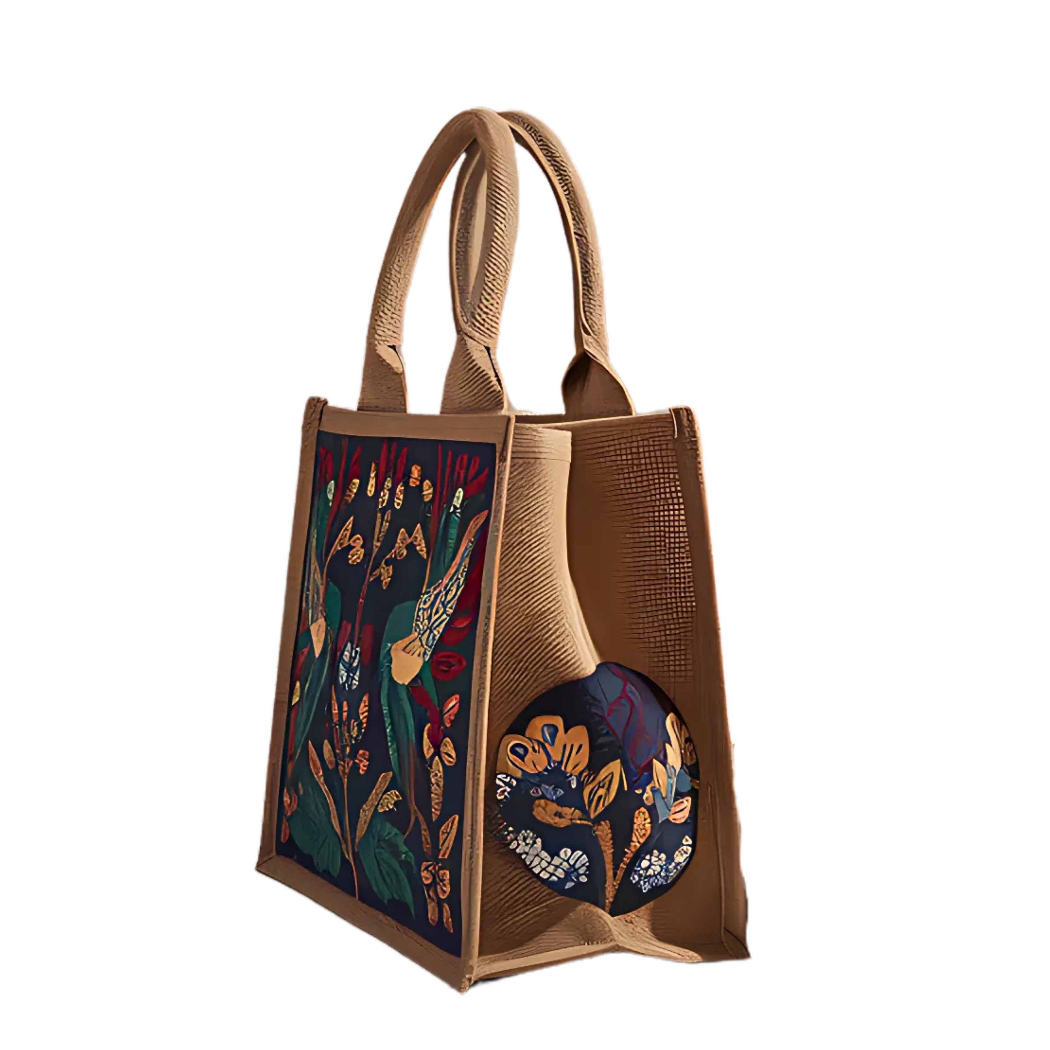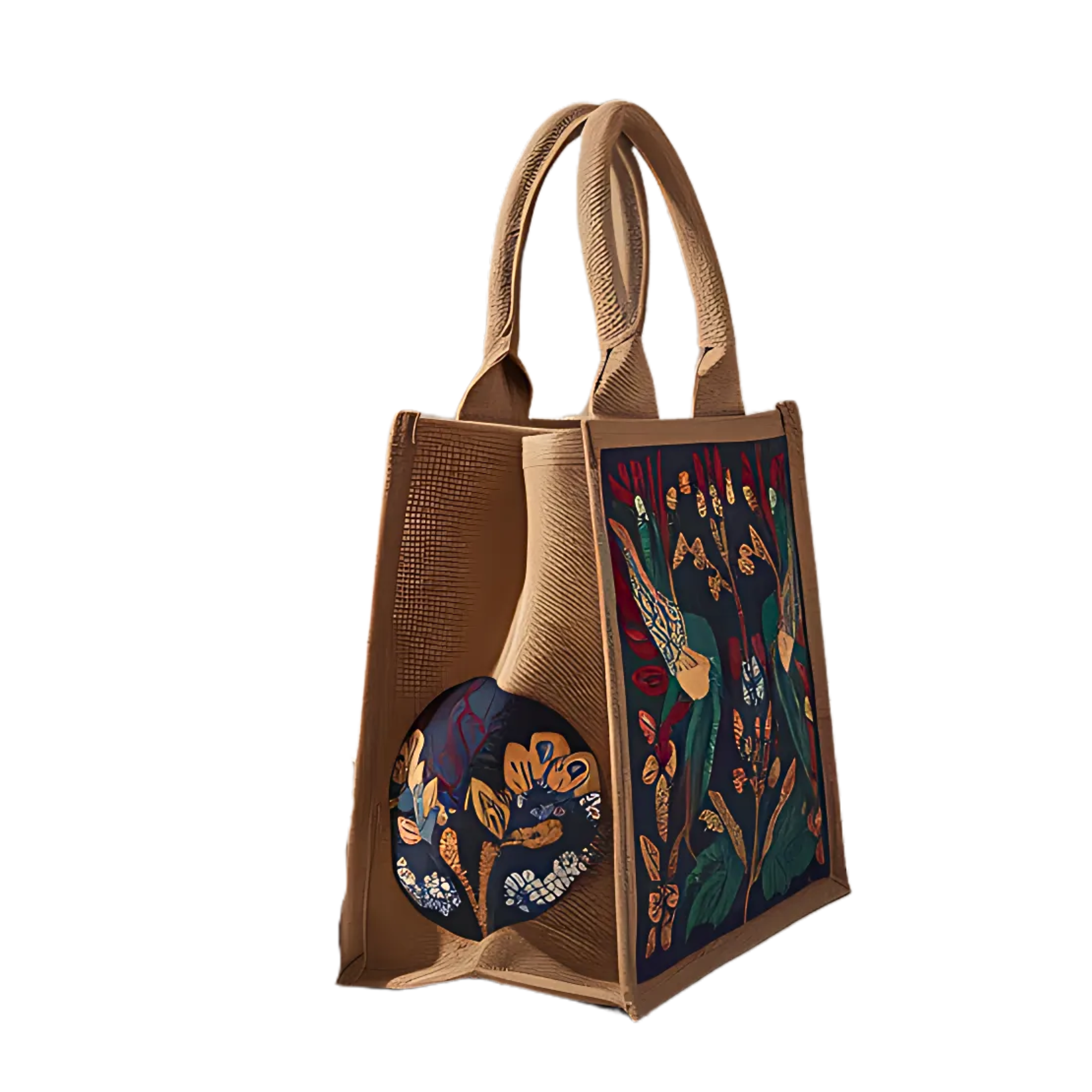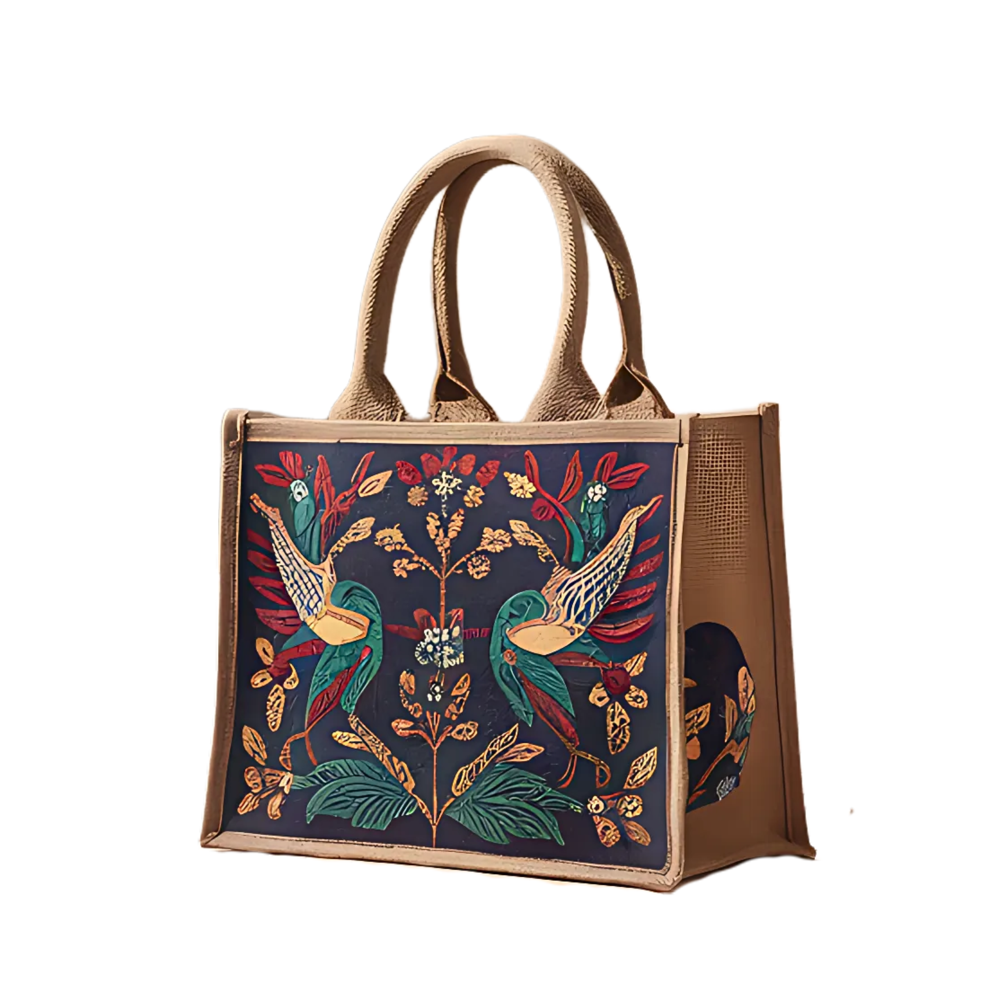 Celebrate artistry and tradition with the Royal Folk Art Jute Tote, a stunning fusion of eco-conscious craftsmanship and vibrant hand-painted design. Made from premium, sustainable jute, this bag showcases an exquisite hand-painted motif of birds and floral patterns, rendered in rich hues of blue, green, red, and gold. The intricate artwork is inspired by traditional folk art, giving the tote a timeless, cultural charm.
