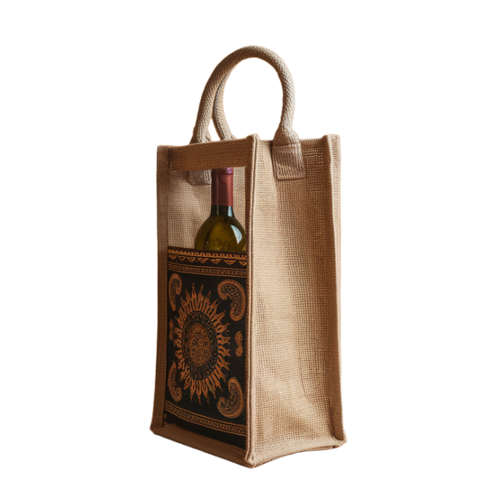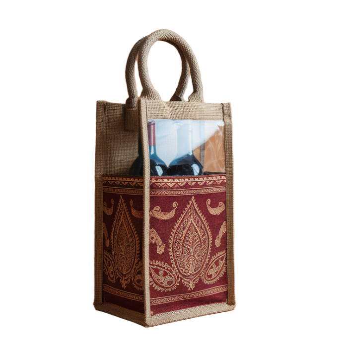 A stylish and eco-friendly jute wine bag designed to hold two bottles securely in separate compartments. Featuring a transparent front panel for easy visibility and adorned with elegant Indian-inspired patterns in rich earthy tones, this bag combines functionality with artistic charm. The sturdy jute handles ensure comfortable carrying, making it an ideal choice for wine gifting, celebrations, or everyday use. Durable, reusable, and effortlessly sophisticated, it’s the perfect accessory for wine lovers who appreciate both sustainability and style.